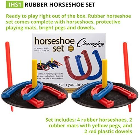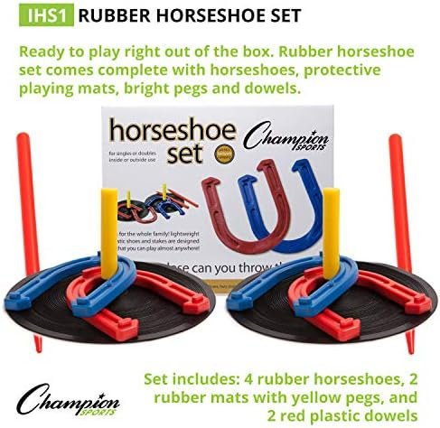Everything you need to play: With 4 horseshoes, 2 rubber mats with center pegs, and 2 red plastic dowels, this horseshoe set comes with everything needed to start a game in your backyard, on the playground, or in the gym