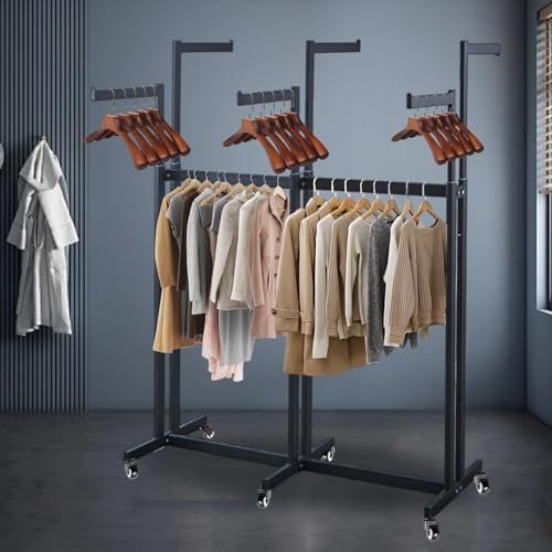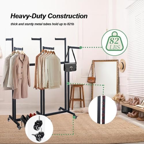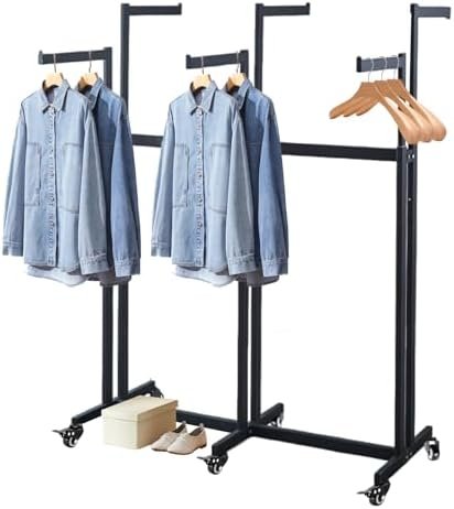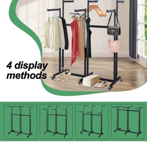 The adjustable rack can hold up to 60 pounds of clothes and accessories, highlighting featured merchandise on retail floors or neatly organizing garments in small spaces.