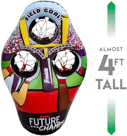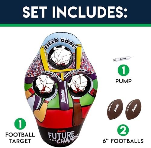 SET INCLUDES: (1) 45” inflatable 3-hole football target with water-fillable base, (2) 7.25” rotationally molded PVC footballs, (1) sports ball hand air pump with needle