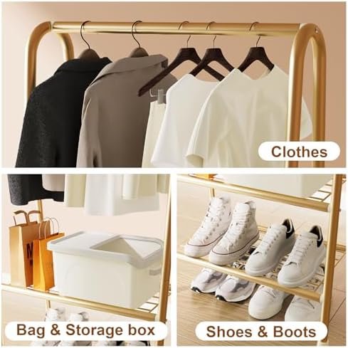 【Double layer storage design】This clothes hanger meets the daily clothing storage. Double shelves can hold storage boxes, shoes, boots, baskets and bags, as well as umbrellas. It can help you organize things and make your house cleaner.