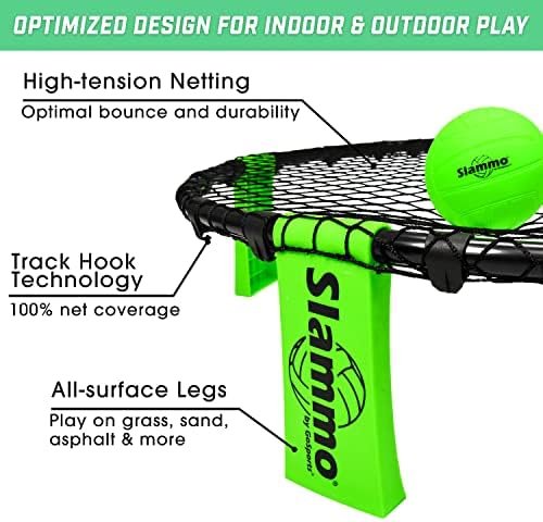WHY CHOOSE SLAMMO: Premium construction at a great value without the inflated price tag; Features high tension netting for optimized bounce, track hook technology for 100% net coverage, and all-surface legs to play anywhere; Designed in the US