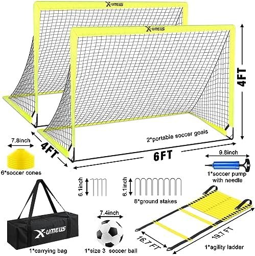 【Complete & Valuable Kids Soccer Net Set】One kids soccer goal kit includes all soccer stuff accessories. 6×4 pop up soccer goals set of 2 , 1 std size 3 soccer ball, 1 inflation pump with needle, 1 adjustable agility ladder, 6 soccer cones, 8 U-shaped metal ground stakes and 1 carrying bag. Whether you’re honing your soccer skills of shooting accuracy and goalkeeping or organizing a friendly soccer tournament, this portable soccer goals will be the centerpiece of unforgettable moments.