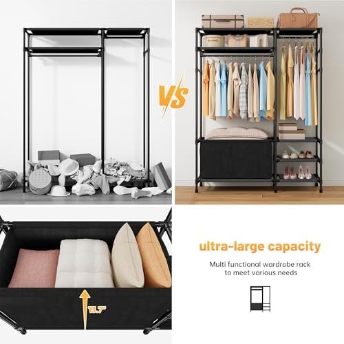 【Spacious Storage Space】Clothes are scattered everywhere, making your house look like a mess? Here comes the solution—Raybee clothing racks for hanging clothes offers you 2 spacious storage areas for hanging up clothes, plus multiple shelves for folded clothing, and large storage bag to offer a comprehensive solution for organizing your bedroom or entryway area. You can hang up all the clothes of your family. Maximize the space to place your stuff and keep your home clean all the time.