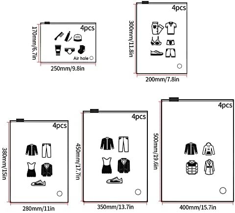 Package Includes:You will receive a total of 20 pcs travel storage bags with zips, 5 sizes in: 20*30 cm/7.8*11.8 inch; 25*17 cm/9.8*6.7 inch; 28*38 cm/11*15 inch; 35*45 cm/13.8*17.7 inch; 40*50 cm/15.7*19.7 inch, 4 pcs for each size, enough for your daily use.