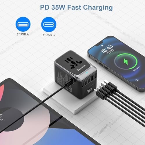 PD 35W Fast Charging: Single use of the USB-C1 provides charging speed up to 35W Max, charge from 0 to 60% in half hour for iPhone 15 Pro; USB-C2/C3/C4: 3A/ 5V 15W Max; USB-A1/A2 : 2.4A/5.0V 12W Max. Ideal for tablet, USB powered laptop, iPhone, Samsung and other Android phones, smart watch and other devices powered by USB port.